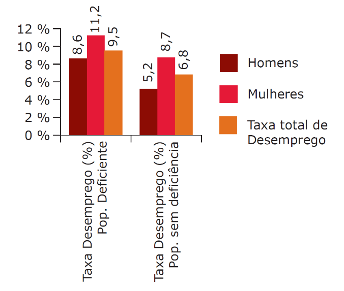 Em 2001, a taxa de desemprego era de 9,5% para as pessoas com deficiência e de 6,8% para as pessoas sem deficiência, destacando-se o desemprego no sexo feminino quando comparado com o sexo masculino, em ambas as populações. No sexo feminino a taxa era superior em mulheres com deficiência.